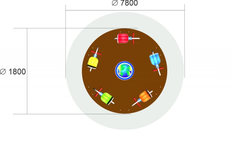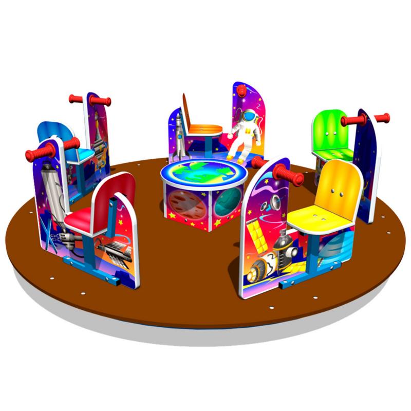 Детская карусель «Космос-5» выполнена в виде пяти отдельных посадочных мест, установленных на платформе. Каждое место оборудовано спинкой. Посадка ребенка на сидение осуществляется верхом. Изображения на сидениях и центральной части нанесены при помощи УФ печати.