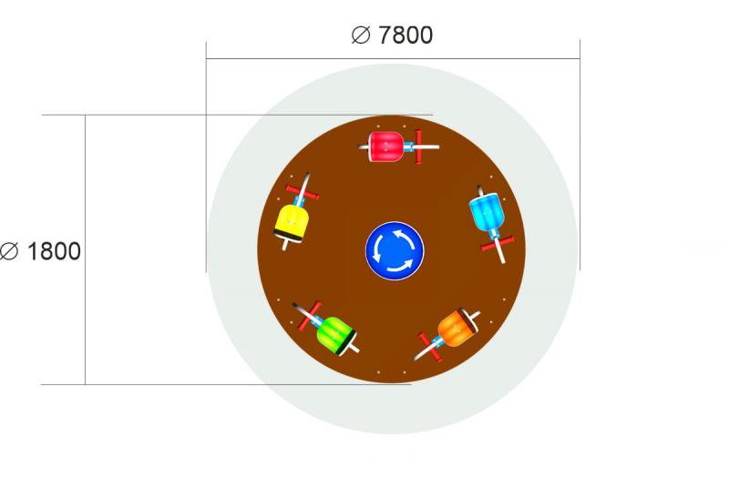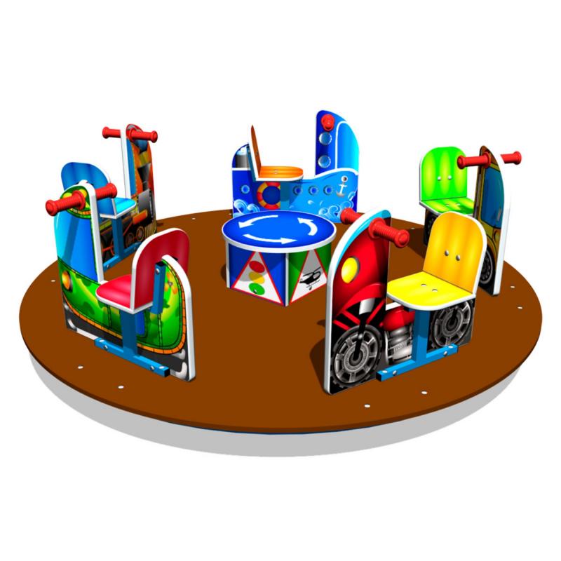 Детская карусель «Транспорт-5» выполнена в виде пяти отдельных посадочных мест, установленных на платформе. Каждое место оборудовано спинкой. Посадка ребенка на сидение осуществляется верхом. Изображения на сидениях и центральной части нанесены при помощи УФ печати.