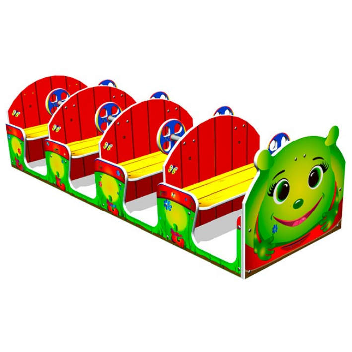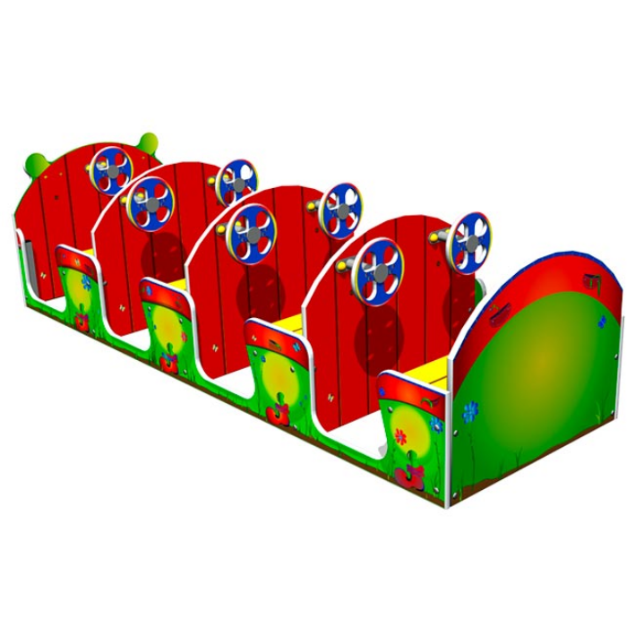 Игровой макет "Машинка Гусеничка" выполнен в виде последовательно расположенных на фанерных бортах сидений с семью рулями. Изделие используется для организации сюжетно-ролевых игр детей дошкольного возраста. Рисунок на панелях изделия выполнен методом прямой UV печати.