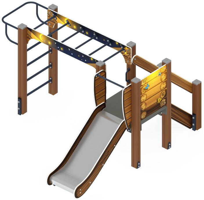 Скат горки шириной 530 мм, выполнен из нержавеющей стали t 1,5 мм, - цельного листа, борта выполнены из влагостойкой фанеры толщиной 24 мм, кромки фанеры тщательно шлифованы, борта окрашены при помощи УФ печати, принт Эко. Ограждения стартового участка горки, выполнены из влагостойкой фанеры толщиной 18 мм, фанера окрашена при помощи УФ печати. Опорный каркас горки выполнен из профиля 40х25 и труб диаметром 32 мм (металл имеет плавные радиусы и тщательную обработку швов, покрыт порошковой краской). Габарит горки 530х1270х750(h).