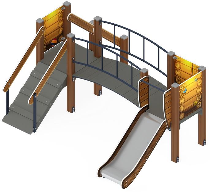 Мост состоит из металлического сварного каркаса из трубы диаметром 32мм, полосы 20х4мм, а также стальных пластин шириной 40мм длиной 120 мм (металл имеет плавные радиусы и тщательную обработку швов, окрашен порошковой краской) и половиц из влагостойкой ламинированной анти-скользящей фанеры, размер 760х100х24 мм в количестве 15 шт на комплект. Мост выгнут по дуге, величина изгиба 150 мм.