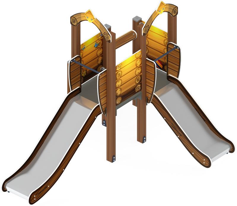 Спаренная башня из шести клеёных брусьев 100х100 мм высота 2200 мм-2 шт., 2000 мм 2шт, 1700 мм-1 шт и 1500 мм-1 шт; полы из ламинированной фанеры, расположены в двух уровнях с анти-скользящим покрытием, габарит 780х780мм толщиной 18мм. Башня украшены декоративными арками. Кромки фанеры тщательно шлифованы. Отметка пола башен от планировочной отметки площадки 750 и 900 мм
