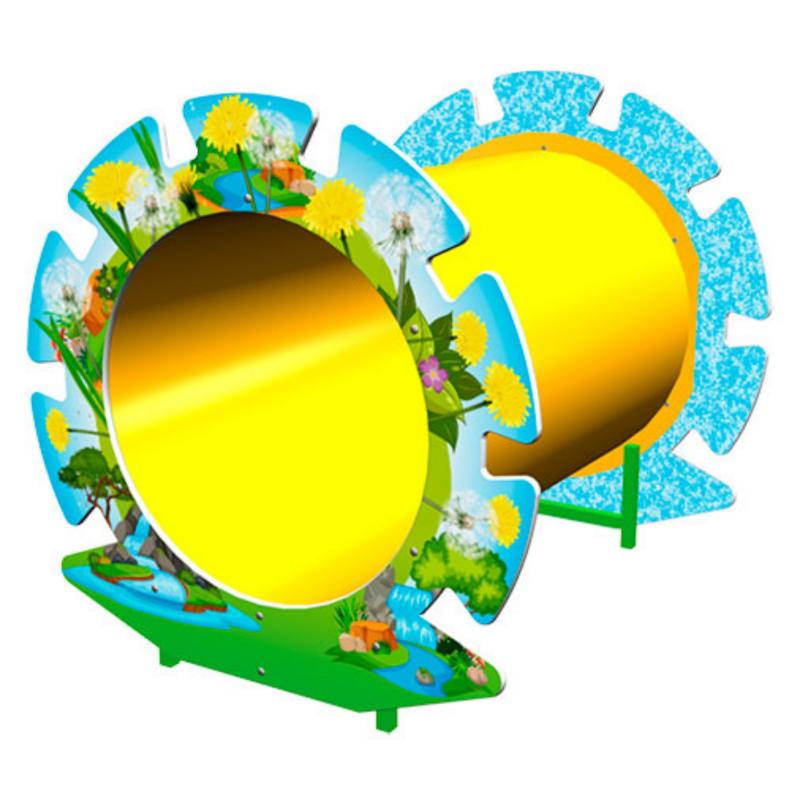 Лаз «Труба-одуванчик» изготовлен из цельнолитой пластмассы и закреплен на опорах металлического каркаса. Входы этого элемента для лазанья оформлены декоративными фанерными накладками. Рисунок на накладки нанесен методом прямой УФ печати.