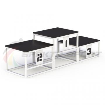 Пьедестал для награждения состоит из трёх тумб разной возвышенности с указателями для первого, второго и третьего места.
