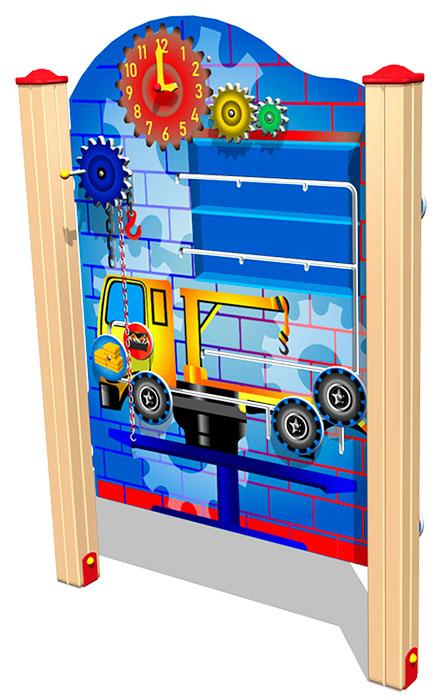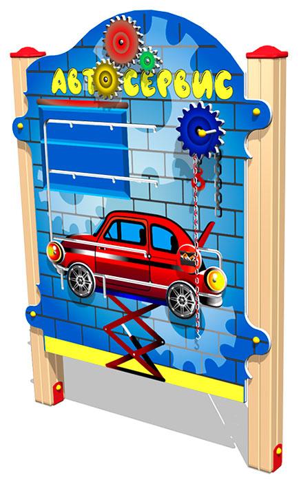 Бизиборд «Автосервис» представляет собой панель, по обеим сторонам которой необходимо поставить колеса на грузовой и легковой автомобили. Бизиборд оснащен имитацией ручной лебедки с пластиковой цепью.