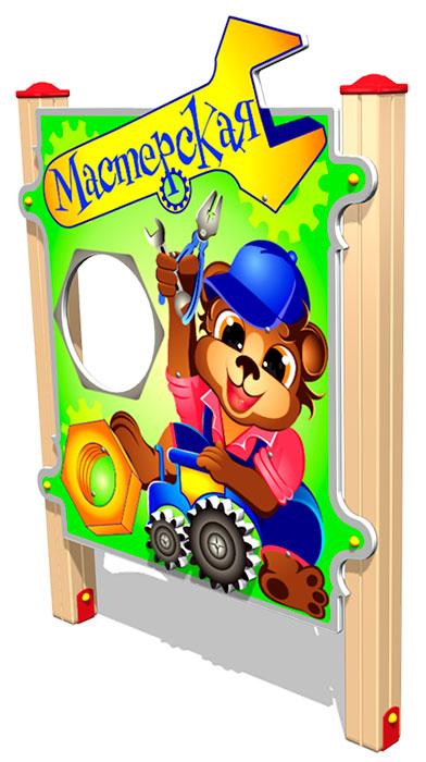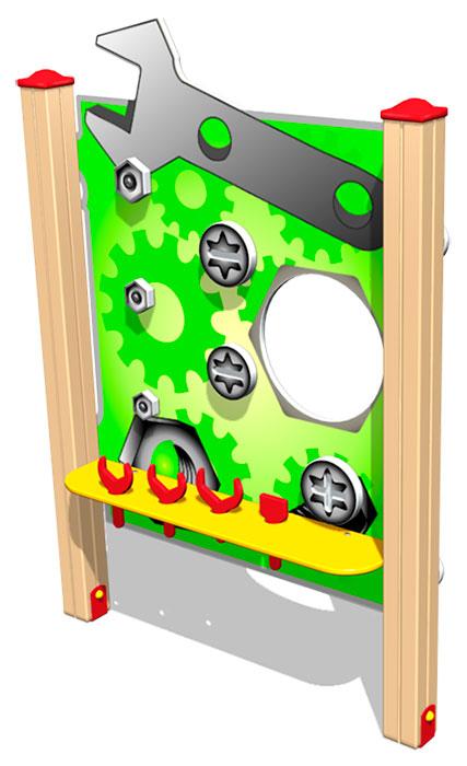 Развивающий элемент-бизиборд «Мастерская У1» представляет собой панель, на которой ребенок может подобрать гаечные ключи к гайками разного размера, отвертки к саморезам и поиграть с шестеренками.