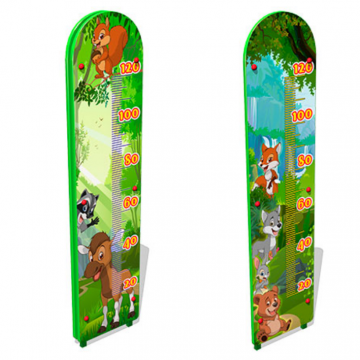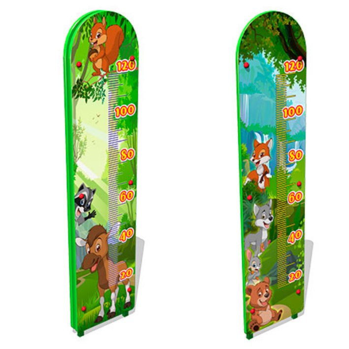 Ростомер детский уличный двусторонний «Лесной мир» представляет собой цельносварную конструкцию, облицованную фанерными накладками с двух сторон. На накладках УФ печатью напечатаны рисунки и шкалы от 20 до 120 см.