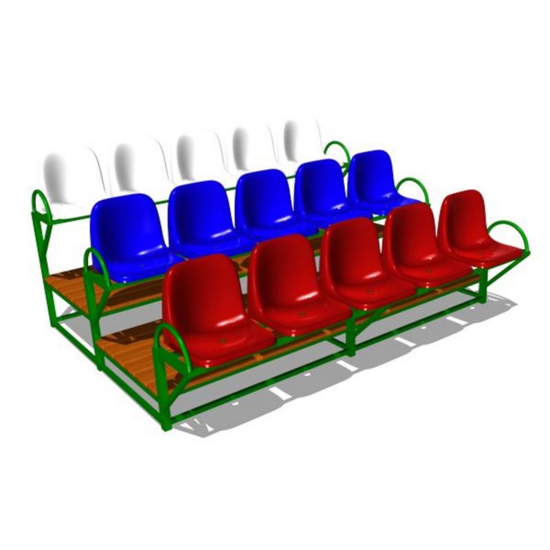 Переносная спортивная трибуна М15 состоит из пятнадцати пластиковых кресел размещенных в три ряда на цельносварном металлическом основании.
