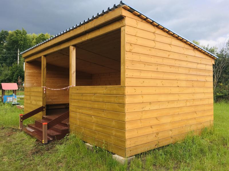 Теневой навес ТН 30.005.002 имеет каркасную конструкцию из бруса 100*100 мм и обшивается с внешней и внутренней стороны имитацией бруса, потолок также подшивается вагонкой или имитацией бруса. По периметру устанавливаются широкие скамейки и вместительный ящик для хранения игрушек с крышкой. Плинтус деревянный по внутреннему периметру.