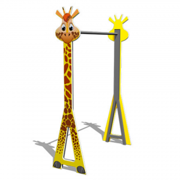 Турник детский «Жираф» имеет классическую форму, выполнен из металла и украшен фигурными фанерными накладками. Изображение жирафа нанесено методом прямой УФ печати и покрыто лаком.