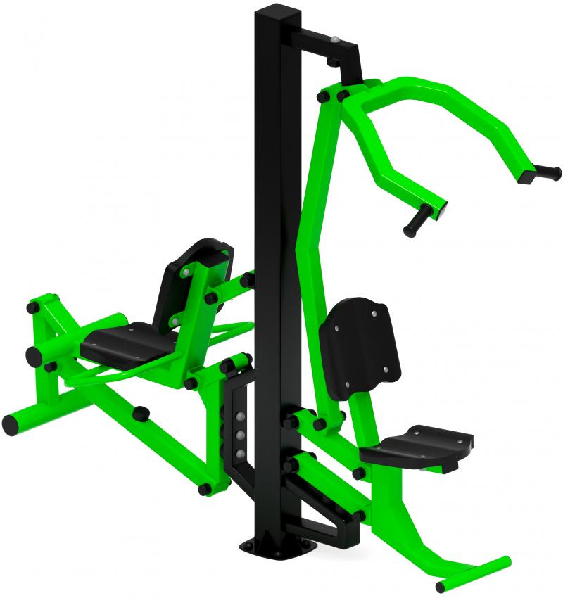 Тренажер Тяга верхняя задействует широчайшие мышцы спины, бицепс, дельтовидные мышцы, большую грудную и малую грудную мышцы, трицепс, и способствуют увеличению мышечной массы спины и рук. Тренажер Флекс предназначен для тренировки мышц ног, укрепления верхней и боковой частей бедра.