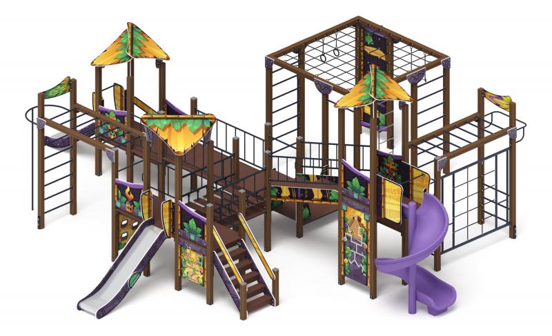 Первая башня - тройная. Состоит из восьми клееных брусьев 100х100 мм, высотой 3000 мм – 4 шт, 2200 и 2000 по 2 шт, окрашенных в коричневый цвет, полы выполнены из ламинированной фанеры, с анти-скользящим покрытием мм толщиной 18 мм, габарит 1000х1900 мм и 1000х900 мм. Кромки фанеры тщательно шлифованы. Отметка пола башни от планировочной отметки площадки 1200 мм